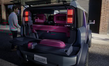 El frontal prescinde de la parrilla tradicional y apuesta por superficies limpias y faros horizontales integrados. La zaga, por su parte, destaca por un gran portón de doble apertura que facilita la carga, mientras que las ruedas situadas en las esquinas maximizan el espacio interior.