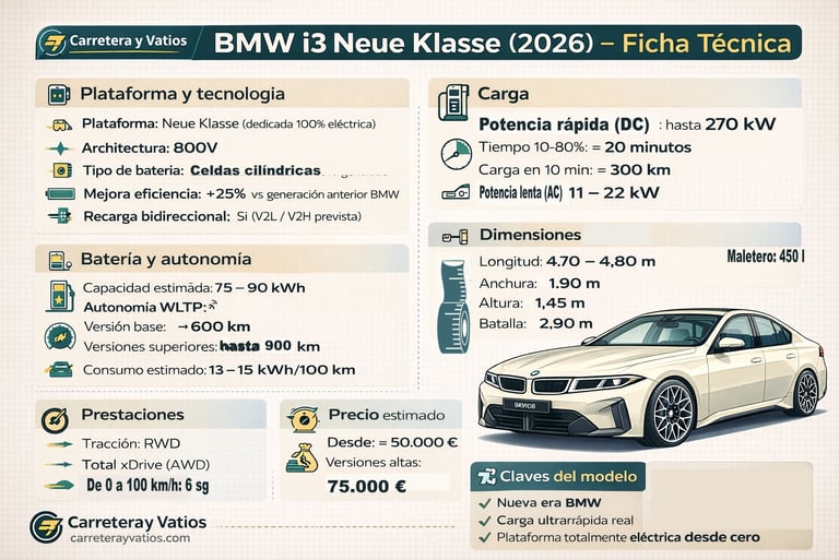 En cuanto al precio, todavía no hay cifras oficiales para España, pero todo apunta a un posicionamiento claramente premium. Si se mantiene la lógica actual de la gama, el i3 Neue Klasse debería moverse en una horquilla similar —o ligeramente superior— a la de los Serie 3 más equipados y a los eléctricos equivalentes del segmento.