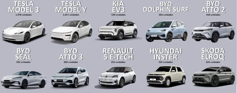 Tesla arrasa con casi 3.000 unidades entre Model 3 y Model Y, mientras BYD coloca cuatro modelos en el 'top ten'